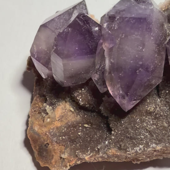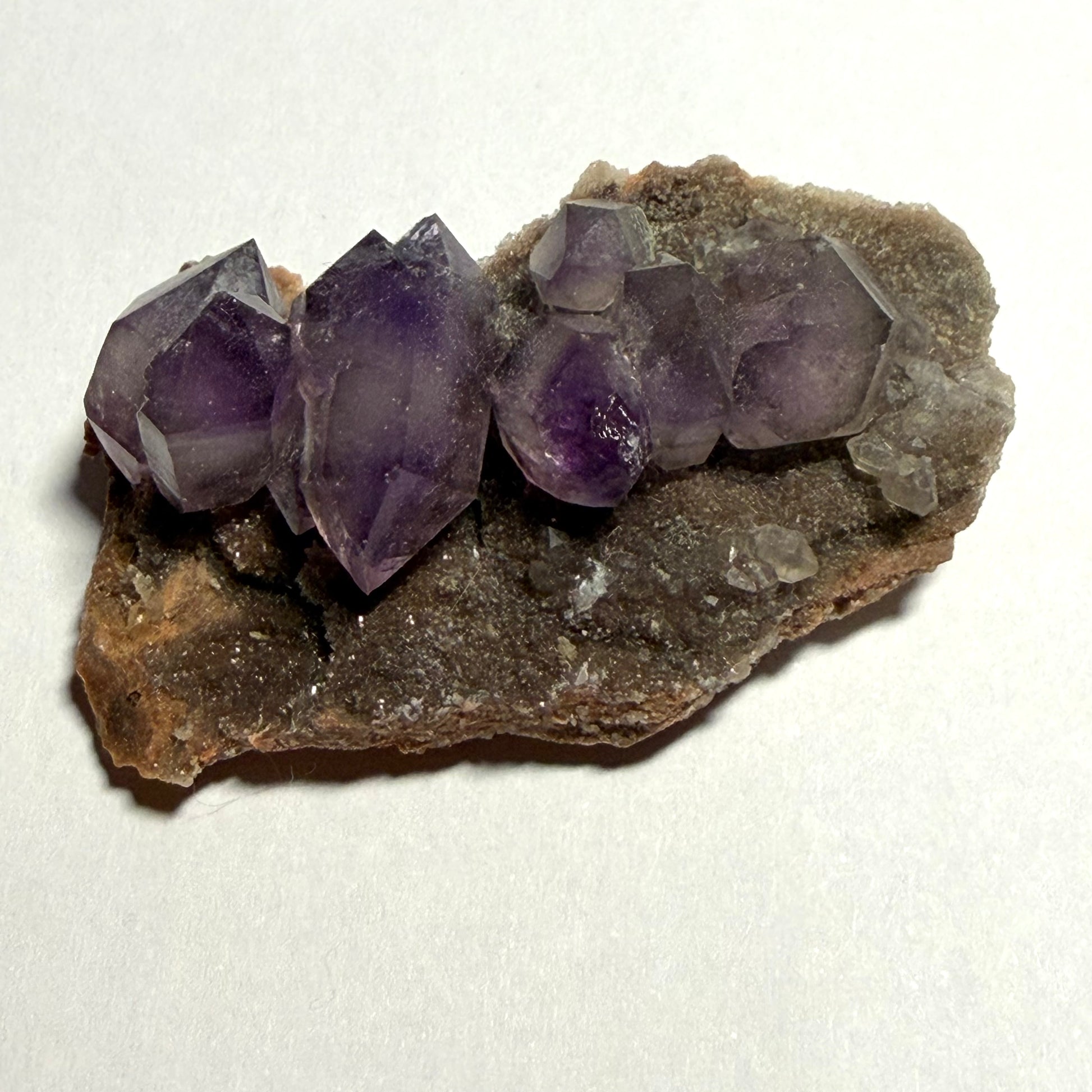 Peu de minéraux en provenance du Kazakhstan sont proposés à la vente. L'échantillon présenté est une Améthyste aux pointes dissociées offrant des dégradés violets intenses. Les cristaux sont biterminés.