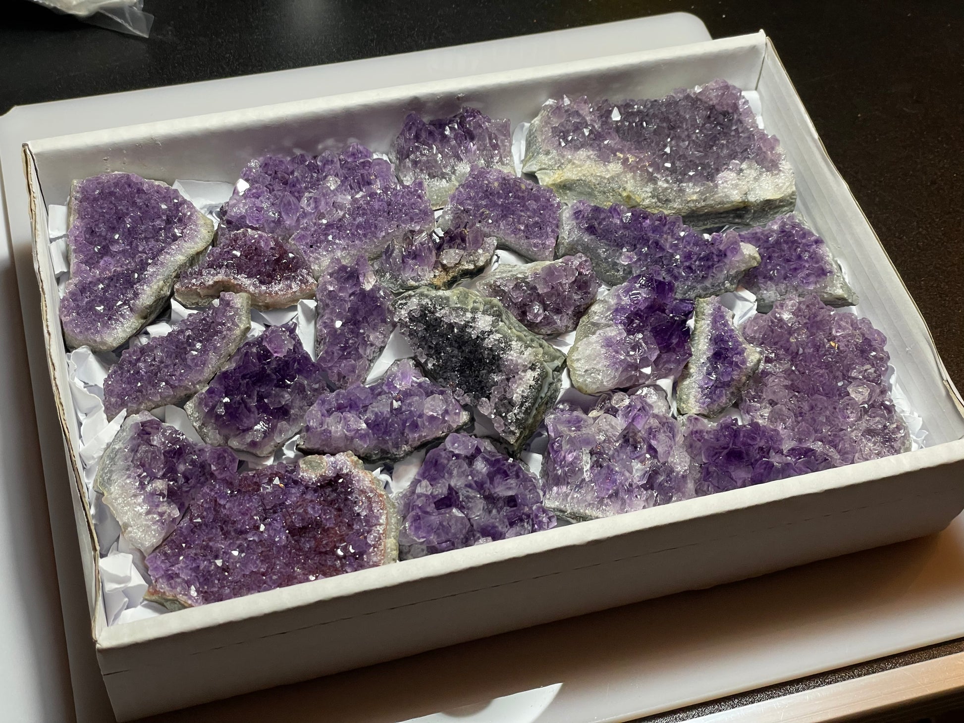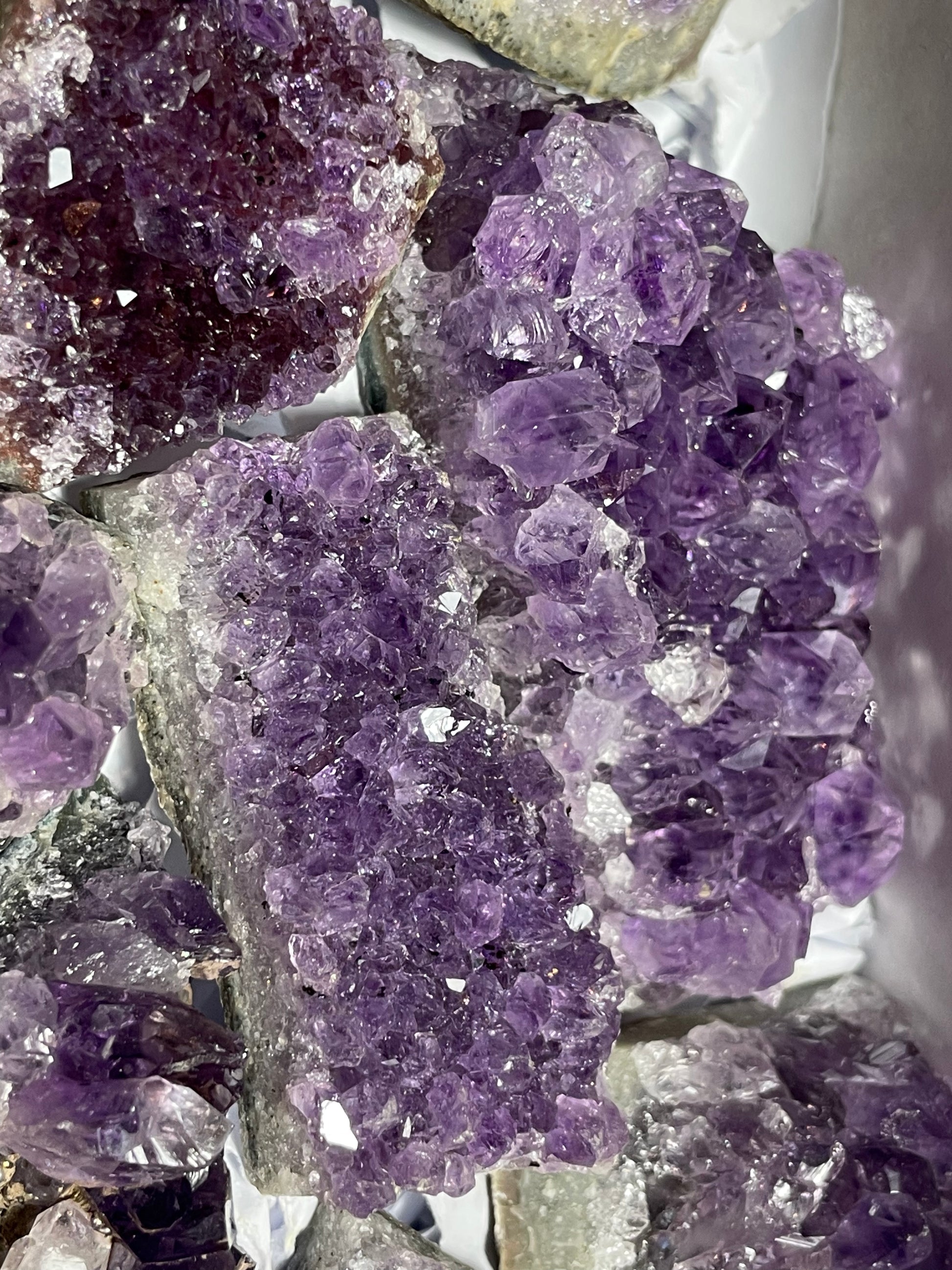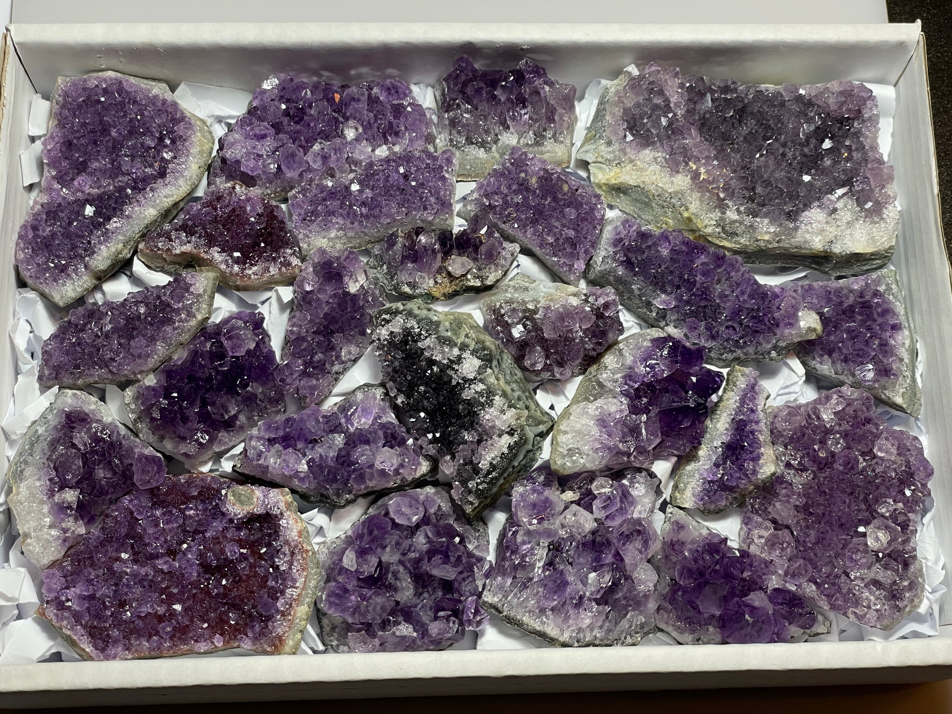 box d’Améthyste d’Uruguay, druzes de belle qualité, belle couleur, poids 1,8 kg environ