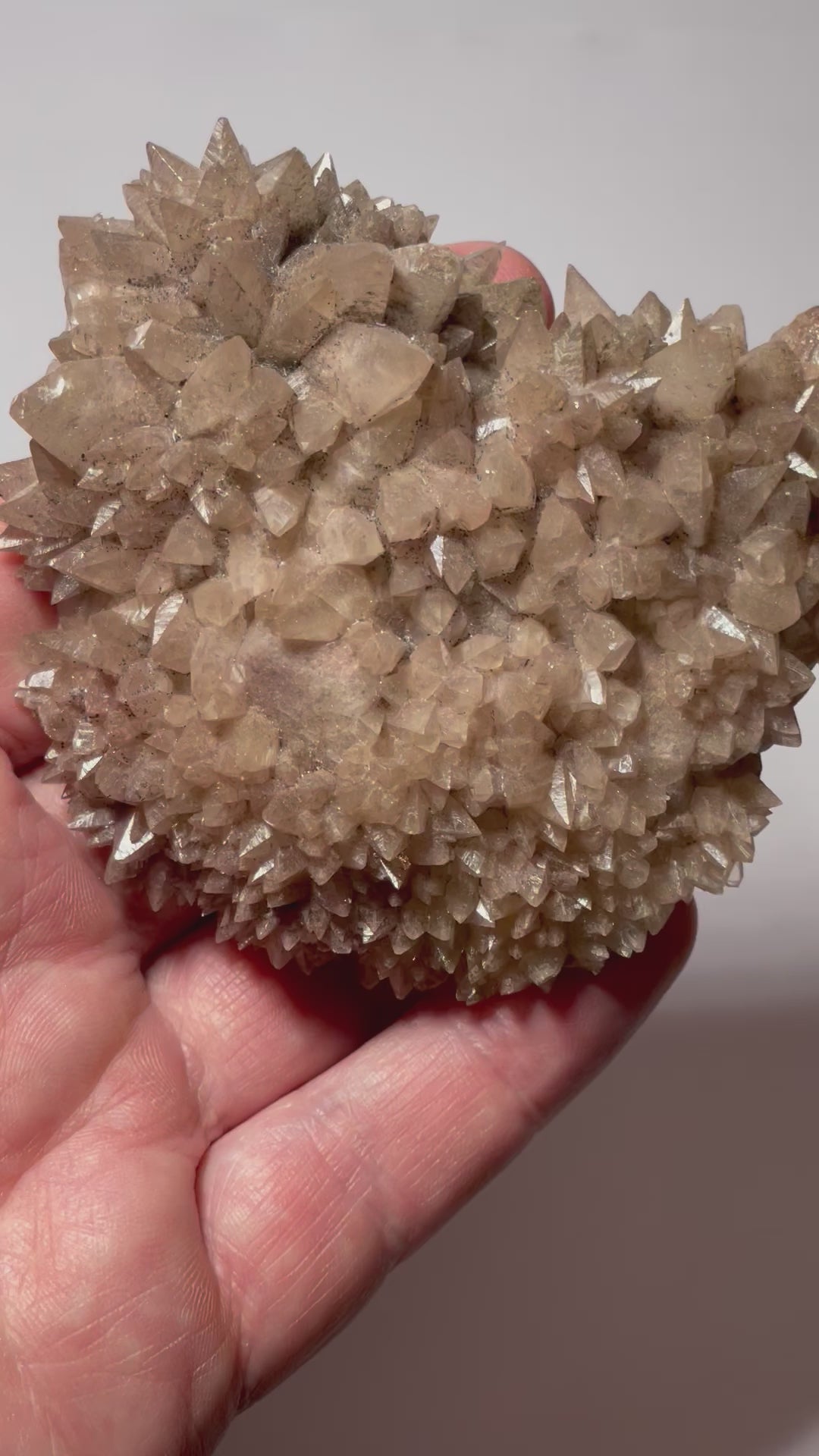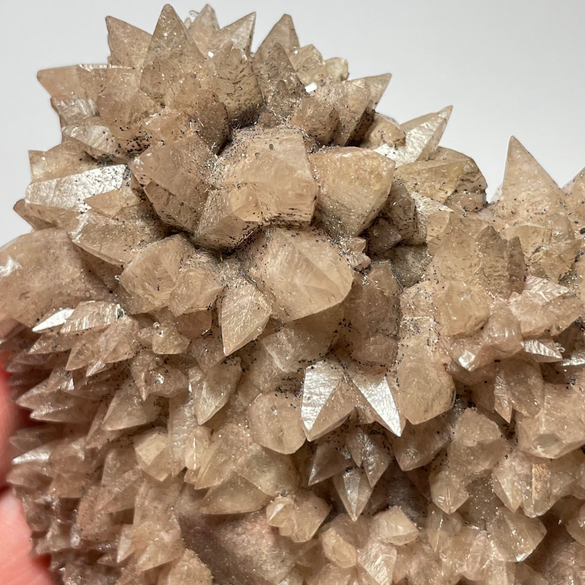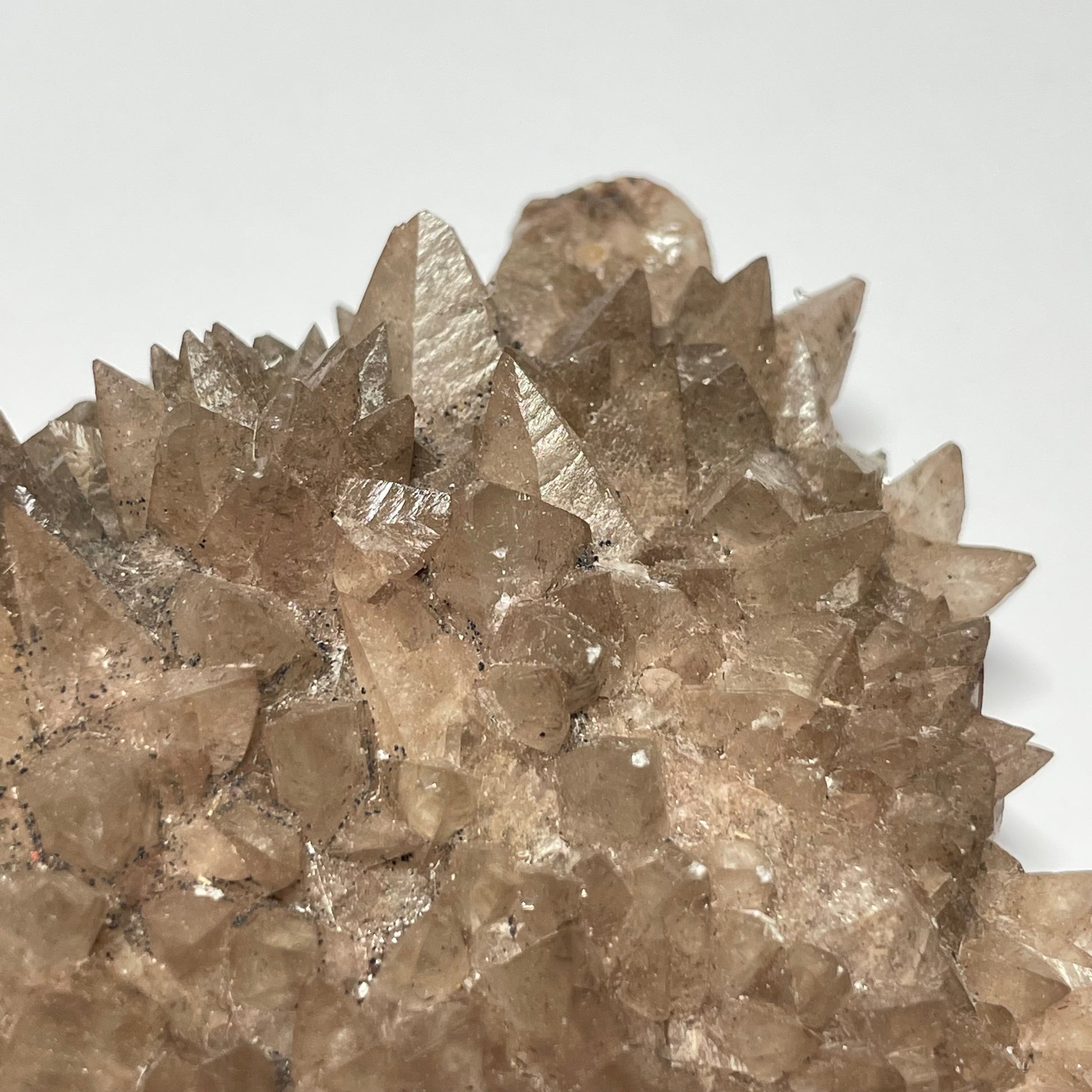 Jolie calcite avec une cristalisation dite « dents de chien » et une couleur très particulière, entre le marron et le gris.