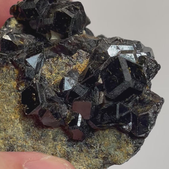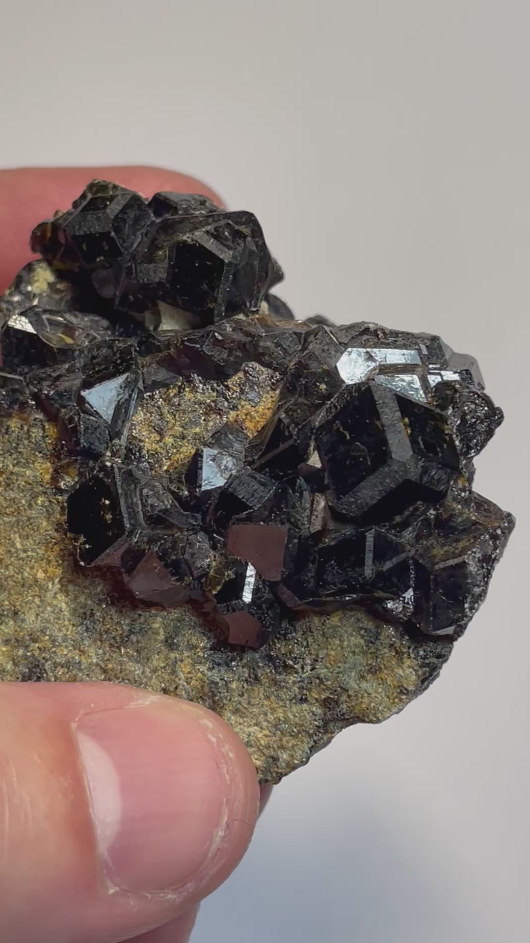 Un bel ensemble de Grenat Andradite avec quelques traces de Pargasite ; pour information la Pargasite est un silicate de la famille des Amphiboles, ici de couleur vert noir opaque.