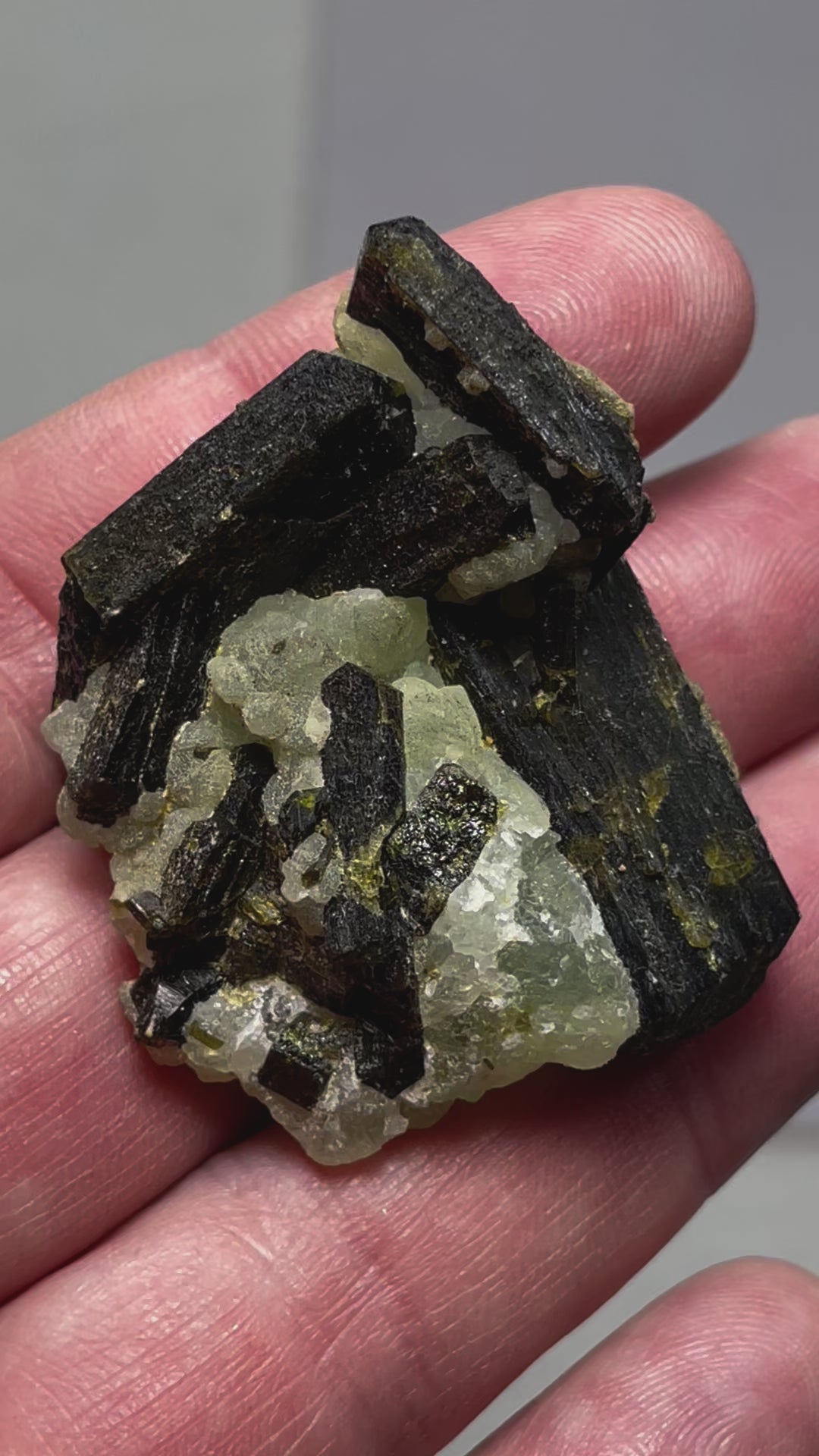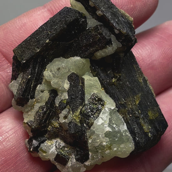 De l'Epidote aux cristaux prismatiques épais et un encroutement de Prehnite translucide vert pâle. La Prehnite, minéral hydrothermal, très souvent sphérique est un silicate d' aluminium cristallisant dans le système orthorhombique.