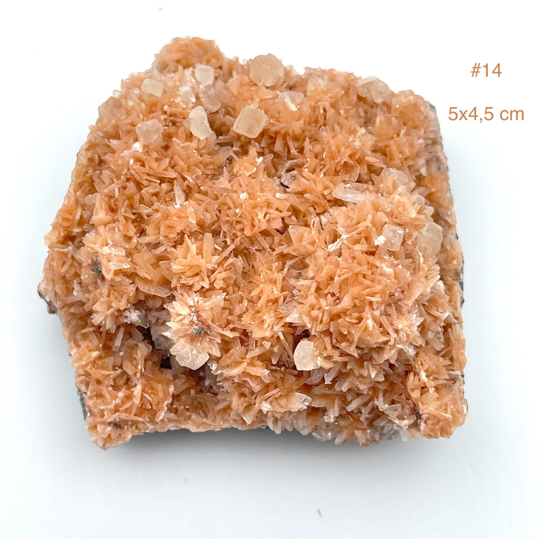 Les spéciemens présentés ici sont recouverts de cristaux de Heulandite lamellaires, légèrement trapézoïdales, avec une jolie couleur rose orangée. La Heulandite est associée à des cristaux et des gerbes de Stilbite blanches ou beiges et des Calcites incolores.