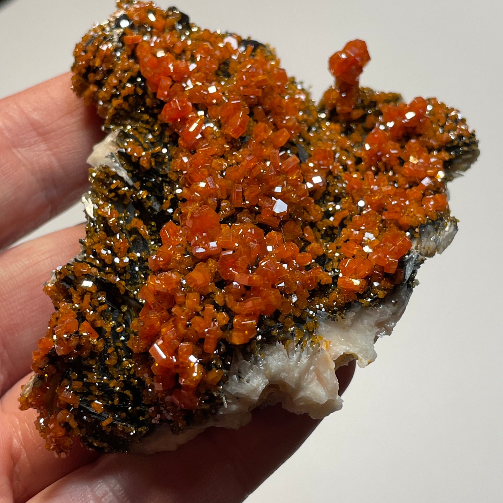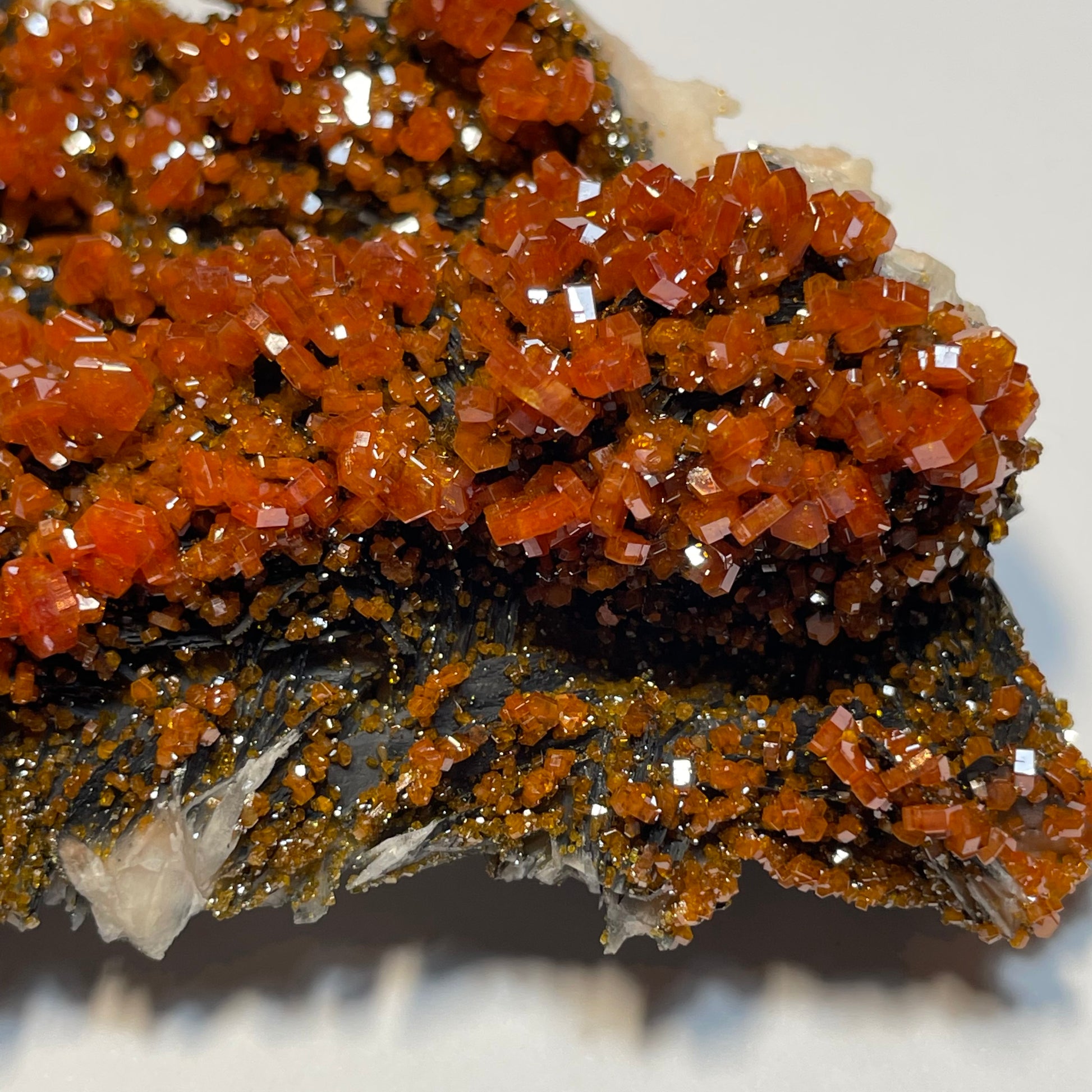 La pièce proposée est un ensemble de petits cristaux de Vanadinite très brillante. La Vanadinite recouvre presque entièrement une cristallisation de Barytine servant de gangue. A cet association s'ajoute de l'hématite noire. Excellent échantillon de collection.
